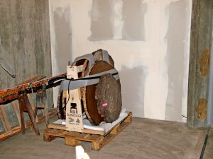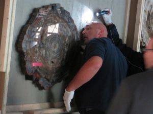 Heute war wieder ein besonderer Tag im Museum. Die großen und schweren Baumscheiben der versteinerten Hölzer sollten von ihrem angestammten Platz abgenommen werden. Die Konservierungs-Verpackungen waren bereits im Vorfeld entfernt worden.