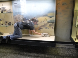 Beim Hantieren mit Exponaten werden weiße Handschuhe getragen, um kein Hautfett auf die Exponate zu übertragen. Manchmal kann man nur kriechend zu einem Exponat gelangen.
